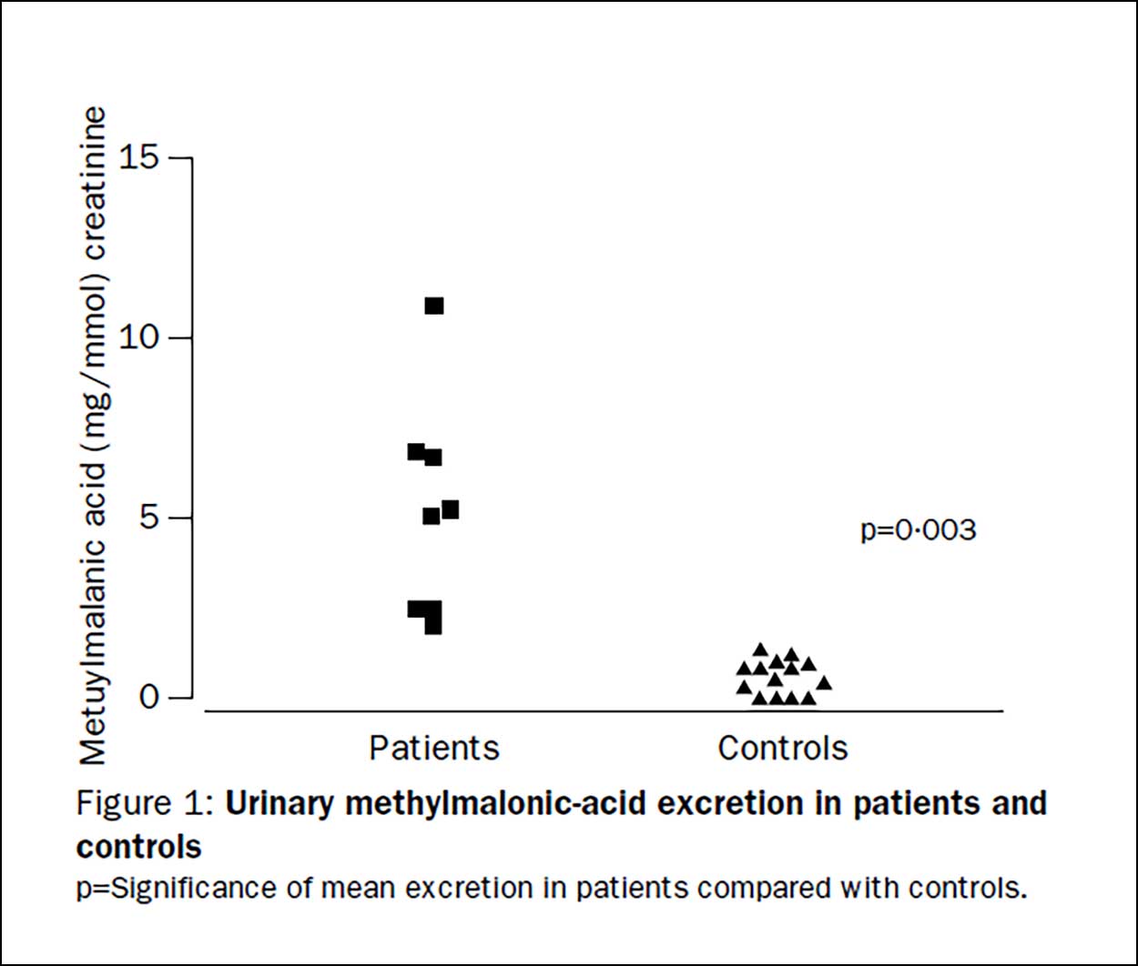 12 children were referred to the pediatric gastroenterology unit with a history of normal development followed by loss of skills and language, diarrhea and stomach pain. In 8 of these children, the parents believed their behavioral deterioration began after the MMR vaccine. In two others, the problems began after a measles infection in one and an ear infection in the other. All of them had intestinal problems, which is not surprising since Dr. Wakefield was a gastroenterologist. One of the test results, showing abnormal urinary methylmalonic-acid excretion in the patients compared to controls is shown in Figure 1 above. It indicates a possible functional vitamin B12 deficiency even though blood levels of B12 were normal, and this, in turn, may contribute to developmental regression.
